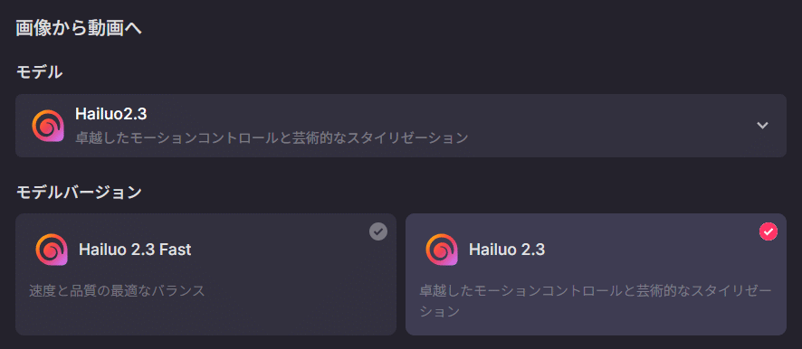 ここでモデルを選択できるので、「Hailuo 2.3」を選択していきます。