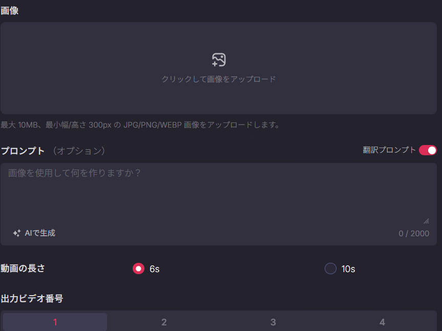 あとは動画の長さ(6秒 or 10秒)を選択して、一回で出力する動画数を選んでいって、「生成」ボタンを押すだけです。